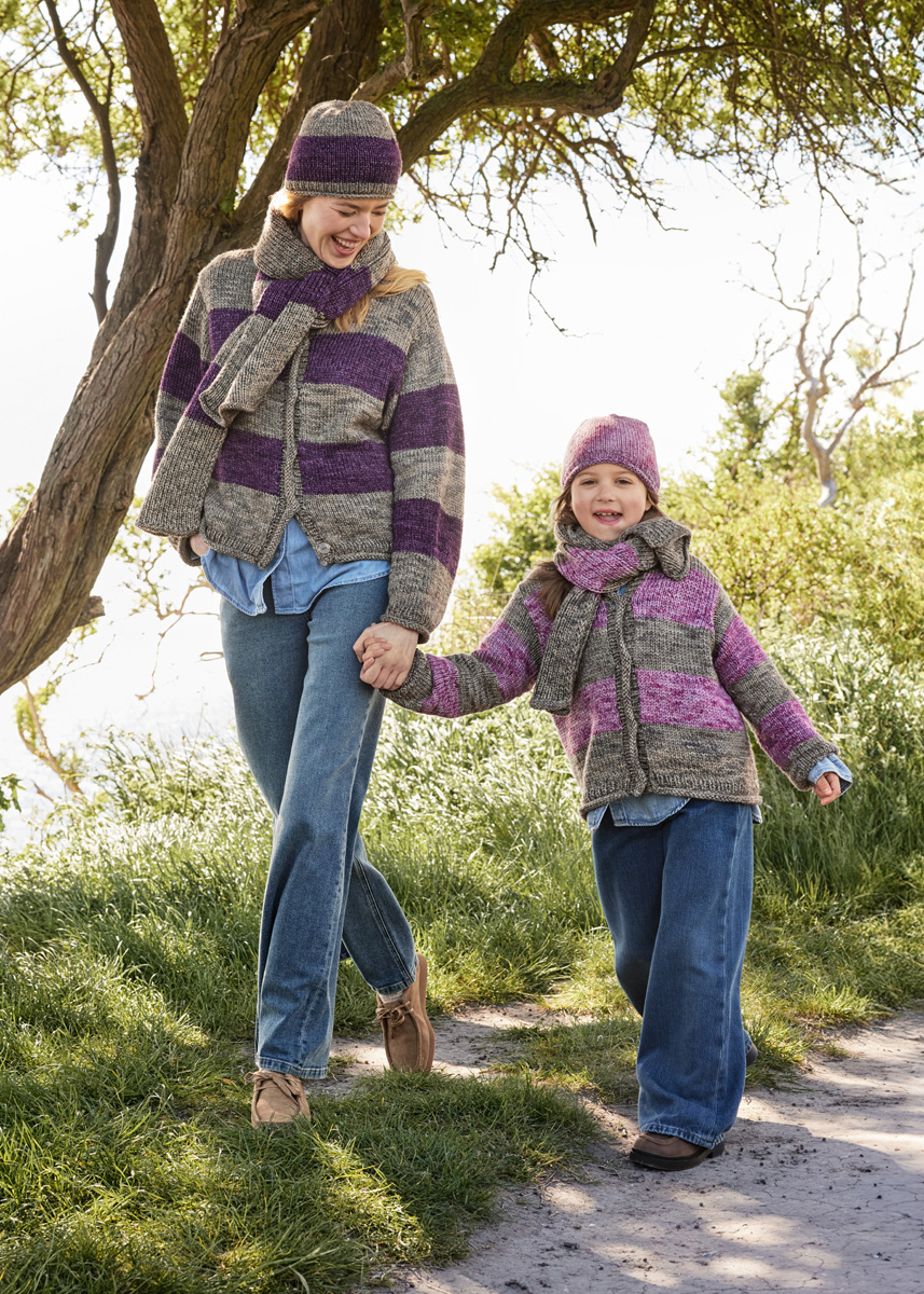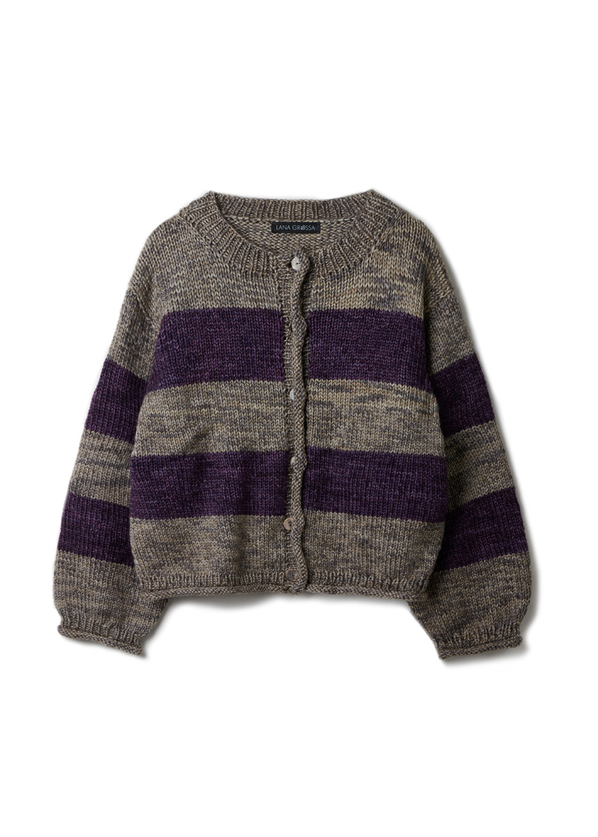 Lana Grossa Vintage Chunky (100% laine vierge (mérinos extrafine), long. de fil 80 m/50 g), 400 (450 - 500) g en beige/kaki (col. 1), 250 (250 - 300) g en violet antique/aubergine (col. 08). Aig. circ. n° 6 de 40 cm, 80 cm, 120 cm de long ; aig. circ. n° 7 de 40 cm, 80 cm, 120 cm de long. 2 aig. aux. pour mettre les m. en attente, 2 AM. 6 boutons, env. 20 mm Ø.