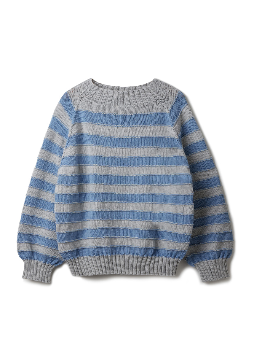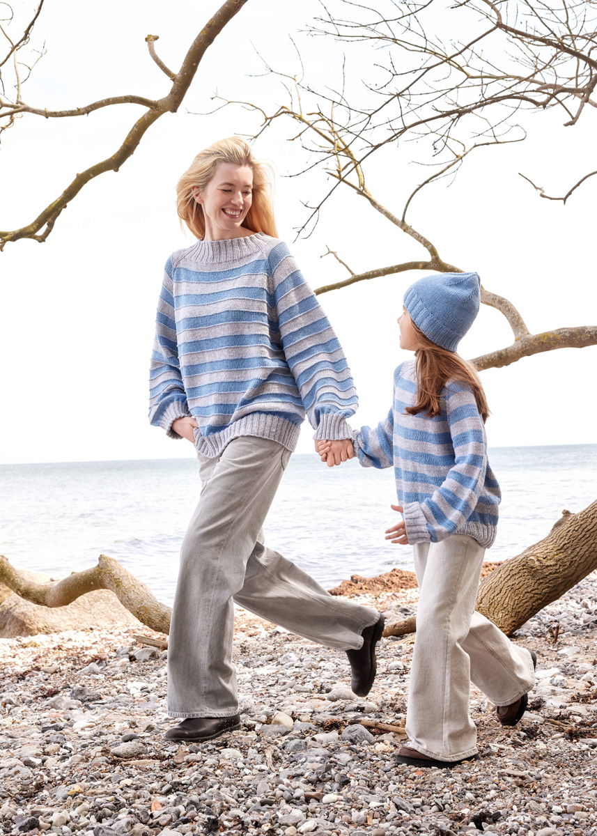 Lana Grossa Cool Wool Big Mélange (100% laine vierge (mérinos extrafine), long. de fil 120 m/50 g), 400 (450 - 450 - 500) g en gris clair chiné (col. 616) et 300 (350 - 350 - 400) g en bleu clair chiné (col. 1620). Aig. à tric. n° 4 de 60 cm et de 120 cm de long ainsi que 5 aig. d´un jeu d´aig. n° 4 ; aig. circ. n° 4,5 de 40 cm, 60 cm, 80 cm, 100 cm et 120 cm de long. 2 aig. aux. pour les m. en attente, 9 anneaux marqueurs (AM).
