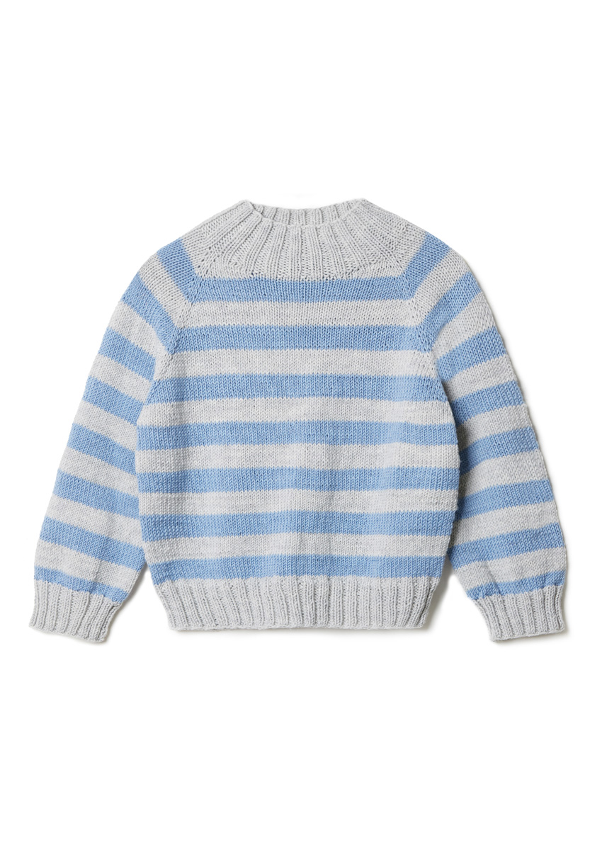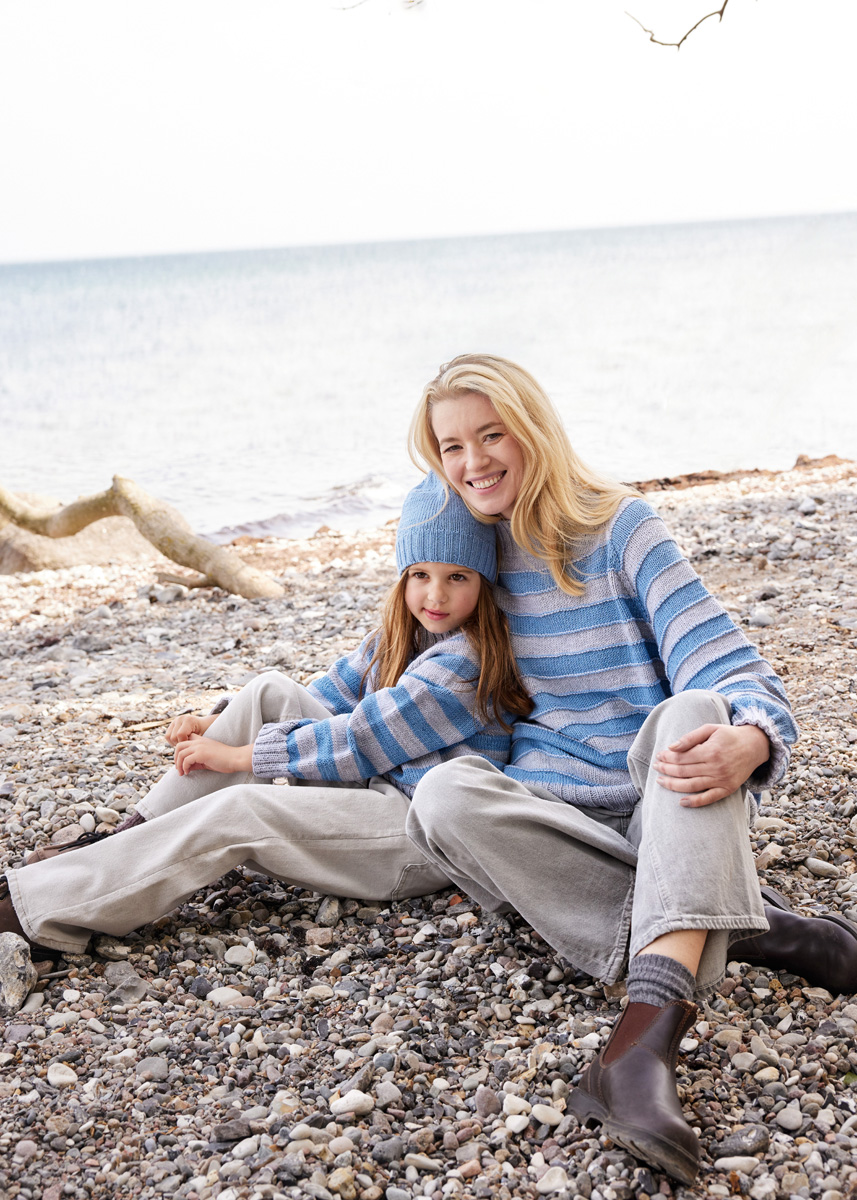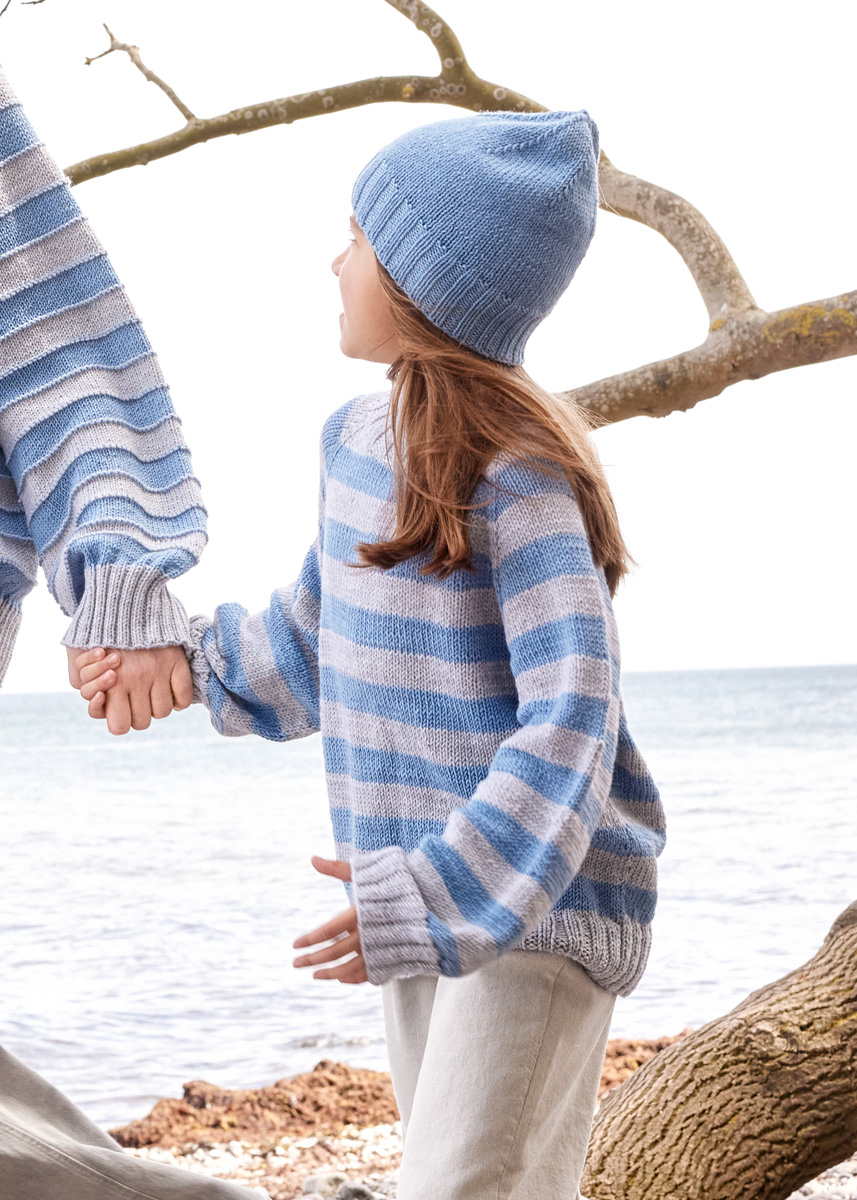 Lana Grossa Cool Wool Big Mélange (100% laine vierge (mérinos extrafine), long. de fil 120 m/50 g), 200 (250 - 300 - 350) g en bleu clair chiné (col. 616) et 150 (150 - 200 - 250) g en bleu clair chiné (col. 1620). Aig. circ. n° 4 de 50 et 100 cm de long ainsi qu´1 jeu d´aig. ; aig. circ. n° 4,5 de 40 cm, 60 cm, 80 cm, 100 cm de long, 2 aig. aux. pour les m. en attente, 9 AM.