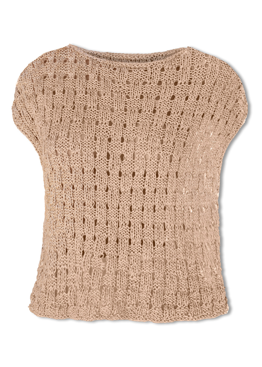 Lana Grossa Tencellino (51 % lin, 49% tencel, long. de fil = env. 125 m/50 g), 250 (300 - 300 - 350) g en bleu clair (col. 10) et 250 (300 - 300 - 350) g en beige (col. 3). Aig. à tric. n° 6. Une aig. circ. courte n° 5.
