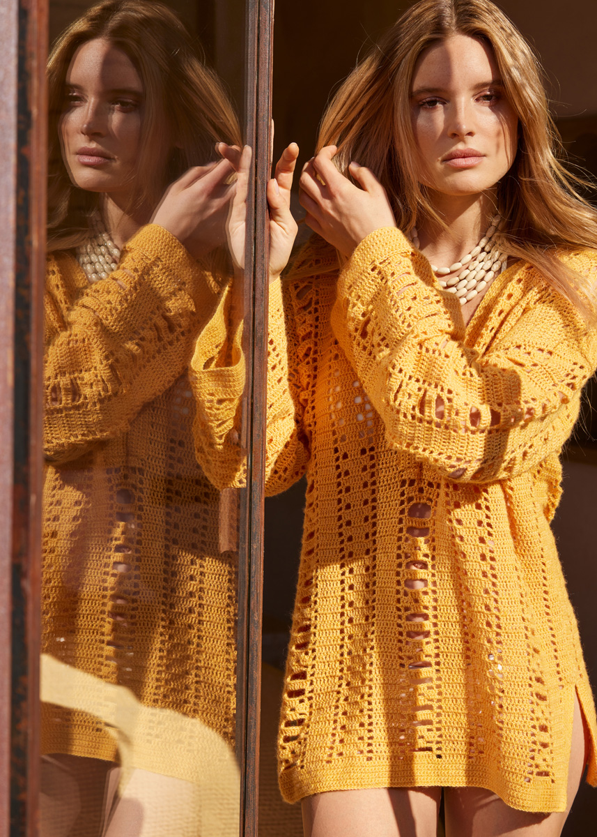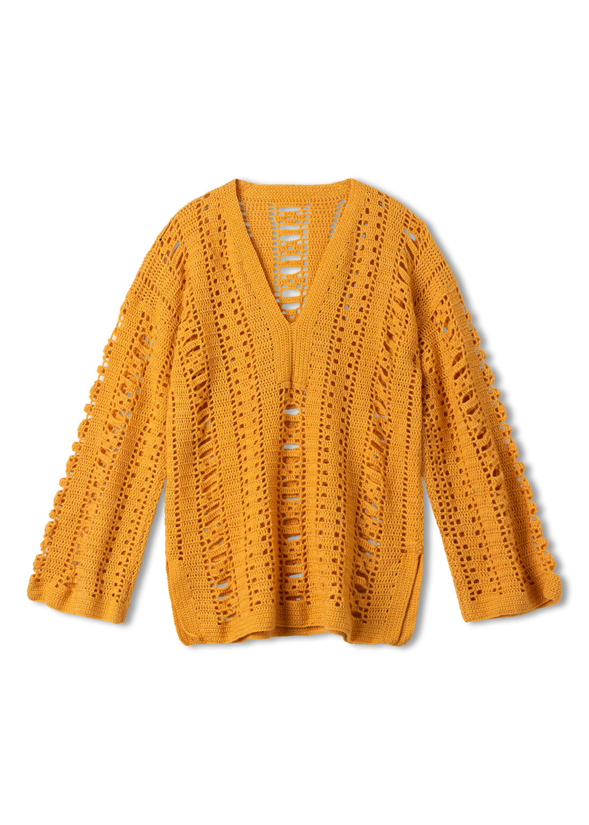 Lana Grossa qualité « Ecopuno » (72% coton, 17% laine vierge (mérinos), 11% Alpaga (bébé), métrage = env. 215 m/50 g), 450 (500 - 550) g en jaune safran (col 216). 1 crochet de taille 4.