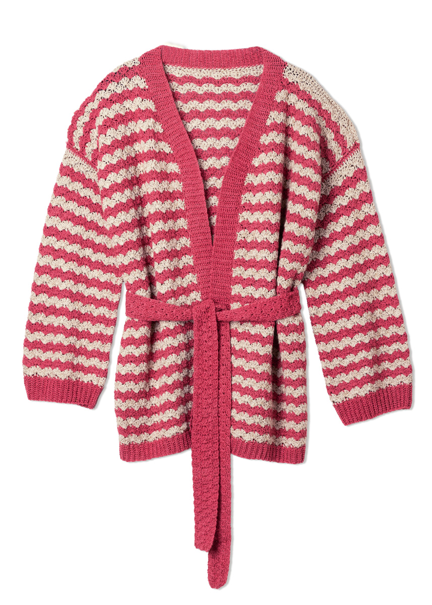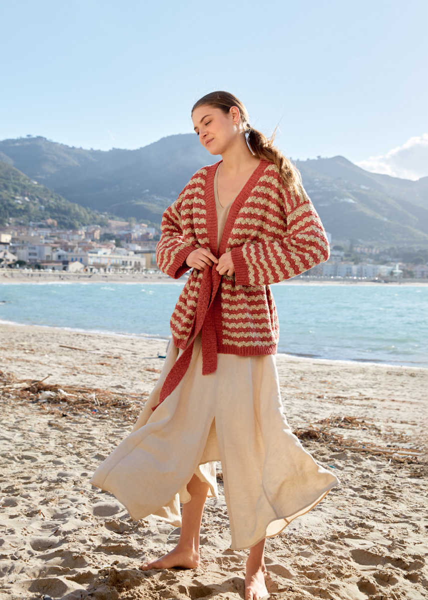 Lana Grossa « Diversa » (74 % coton, 26 % viscose, long. de fil = env. 210 m/50 g) : env. 350 (400) g rouille (col. 22) et env. 250 (300) g beige (col. 30) ; crochets n° 3,5 et 4.