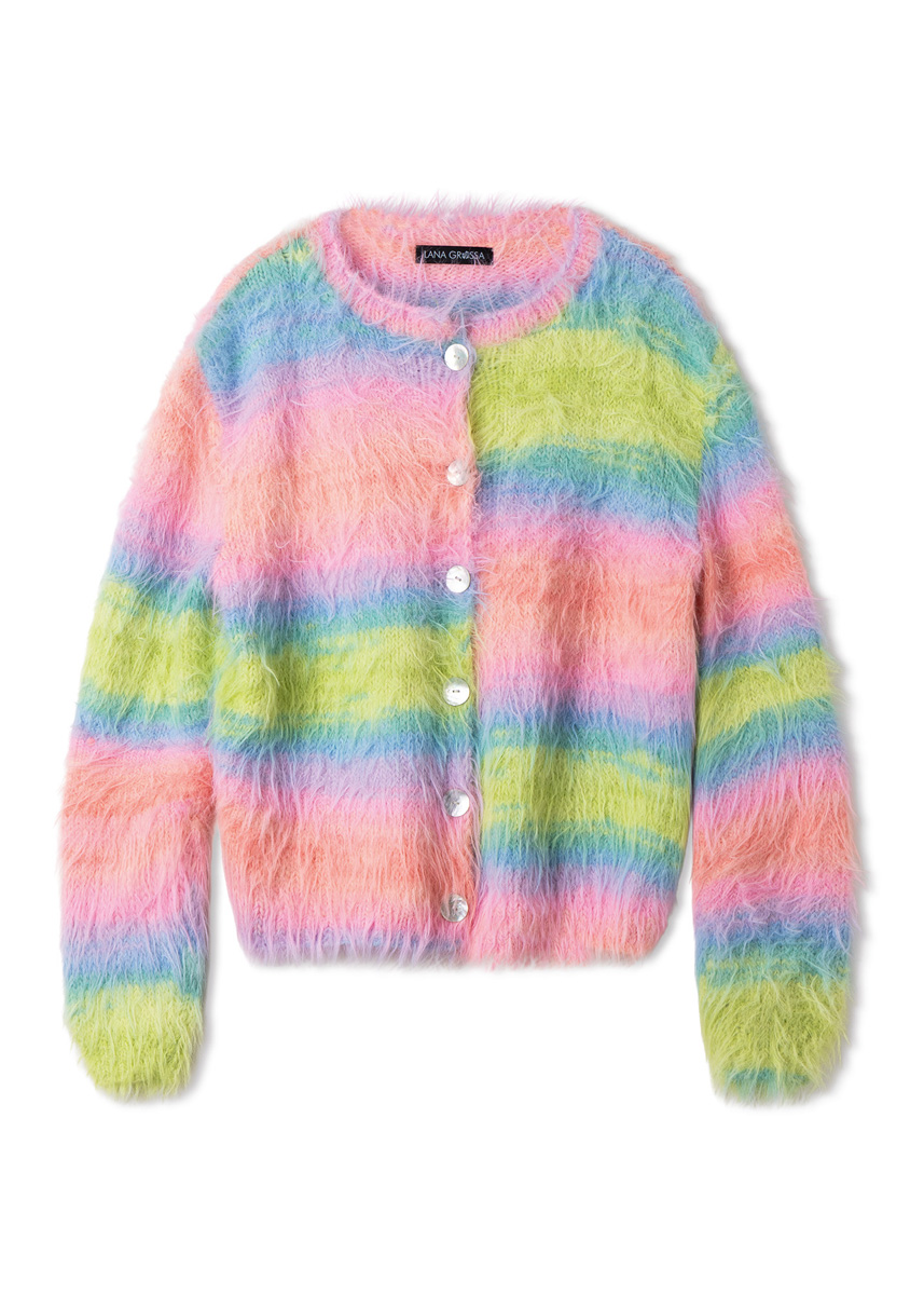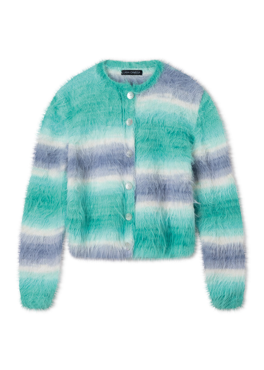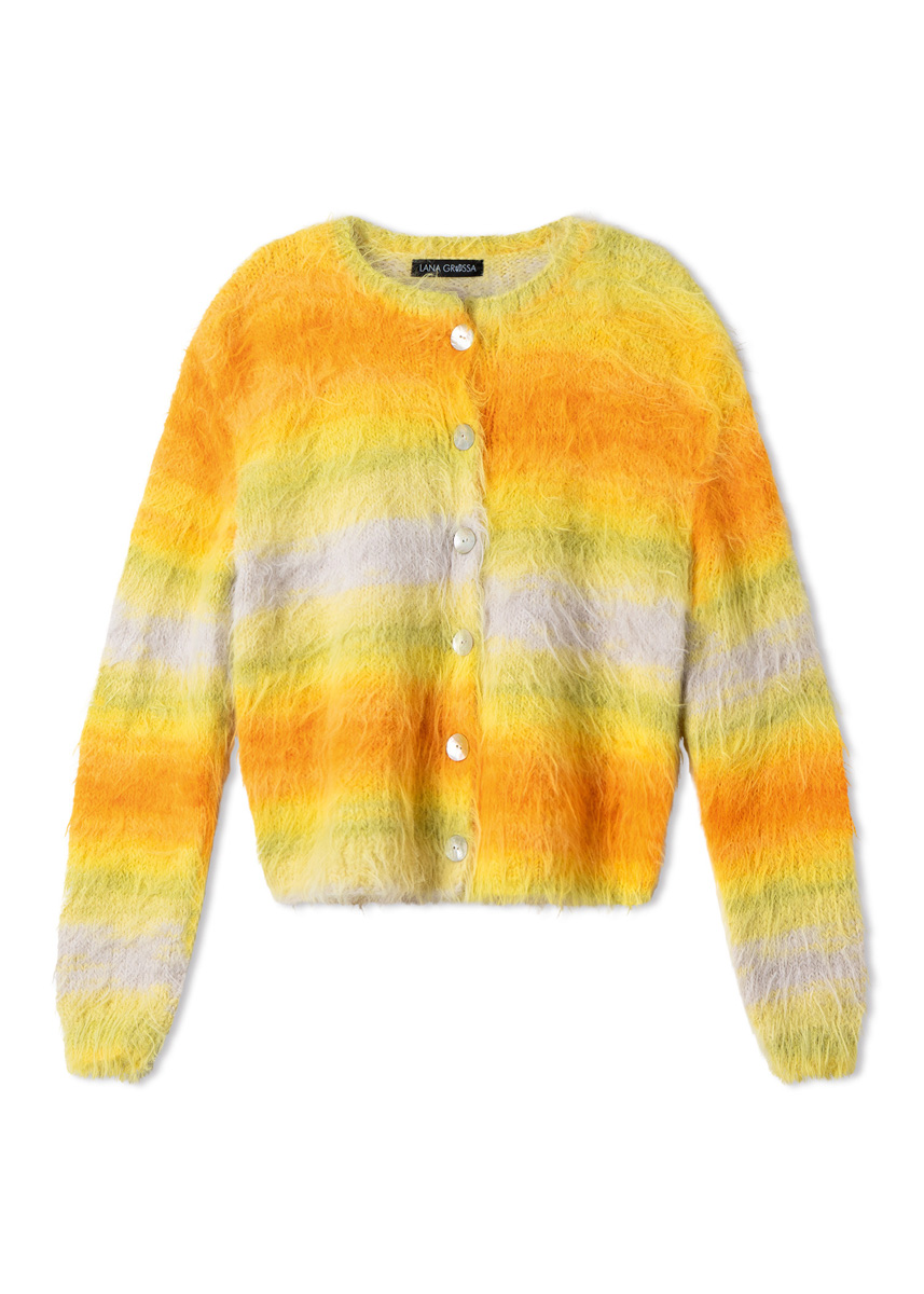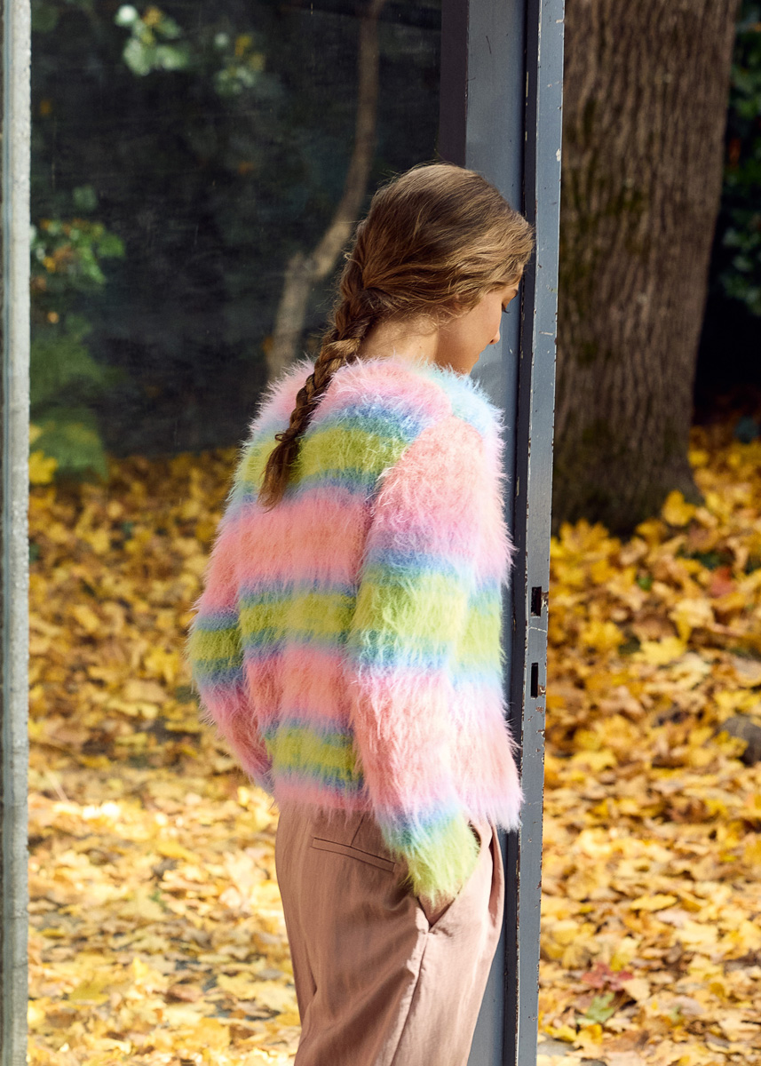 qualité Lana Grossa « Basta Mista » (50 % laine vierge (mérinos), 50 % polyamide, métrage env. 100 m/50 g) : 450 (500 - 550 - 600) g citron vert/turquoise/aqua/saumon/ rose/lilas (col. 113) ou 450 (500 - 550 - 600) g blanc cassé/ gris clair/gris-bleu/vert blanc/turquoise/turquoise menthe (col. 116) ou 450 (500 - 550 - 600) g grège/vanille/jaune/vert jaune/Tournesol/Orange (col. 114) ; aiguilles à tricoter de taille 4 et 4,5 ; 1 aiguille circulaire courte de taille 4 ; 6 boutons en nacre, diamètre 20 mm.