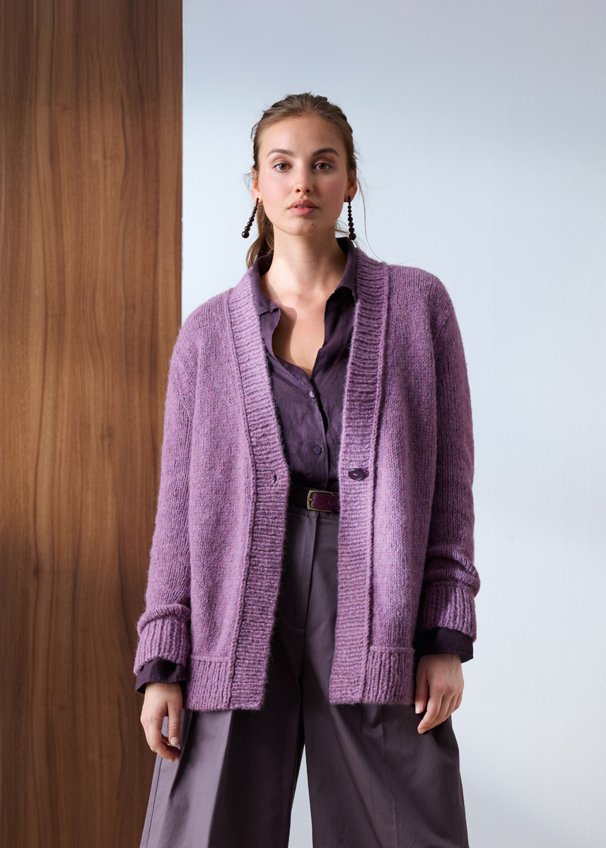 Lana Grossa qualité Brigitte No. 2 (47 % alpaga (bébé), 45 % coton, 8 % laine vierge (mérinos), LL = 140 m/50 g) : 500 (550 - 600 - 650) g mauve (col. 79) ; aiguilles n° 6 et 6,5 ; une aiguille circulaire n° 6 et 6,5 de 100 cm ; 1 bouton Union Knopf, couleur mauve foncé, Ø 22 mm.