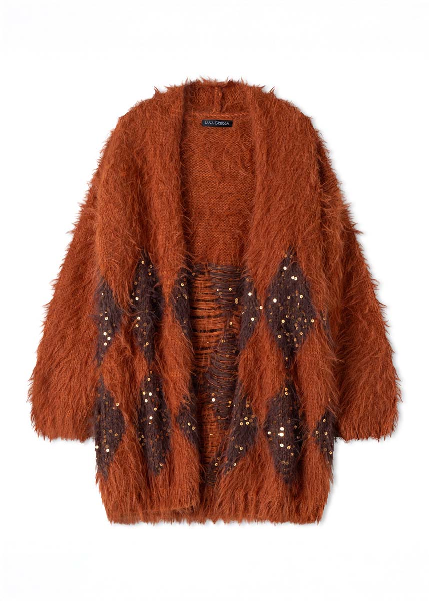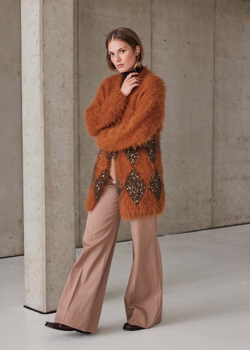 Lana Grossa qualité Ecopuno (72 % coton, 17 % laine vierge (mérinos), 11 % alpaga (bébé), LL = env. 215 m/50 g) : 200 (300) g en rouille (col. 223) et Lana Grossa qualité Basta (50 % laine vierge (mérinos), 50 % polyamide, LL = env. 100 m/50 g) : 450 (550) g en brun rouille (col. 5) et 150 g en brun chocolat (col. 33) et Lana Grossa qualité Cosmo (100 % coton (+ paillettes), LL = env. 260 m/100 g) : 100 g en caramel (col. 8) ; aiguilles n° 7 ; 2 aiguilles auxiliaires pour mettre des mailles en attente.