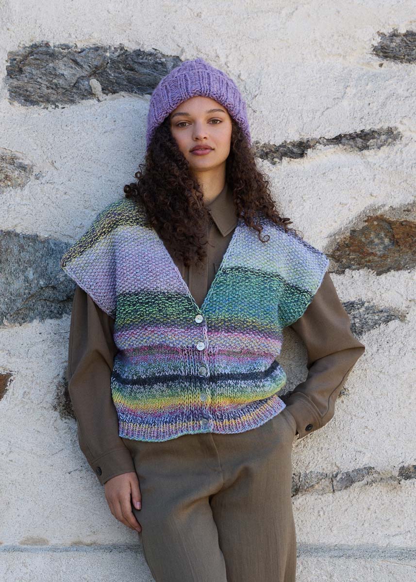 Lana Grossa qualité «Gomitolo Fumo» (50% laine vierge, 50% polyacrylique, long. de fil 700 m/200 g) : 2 (2 - 2 - 3) pelotes = env. 400 (400 - 400 - 600) g blanc vert/vert menthe/gris clair/gris vert/jean/bleu pétrole/rose vif/ vert (col. 514) aig. circ. courte et longue n° 6 et 7 ; 5 boutons à pression en nacre, env. 18 mm de diamètre.