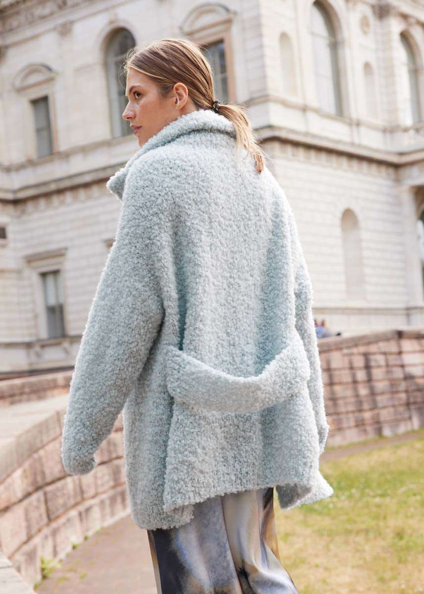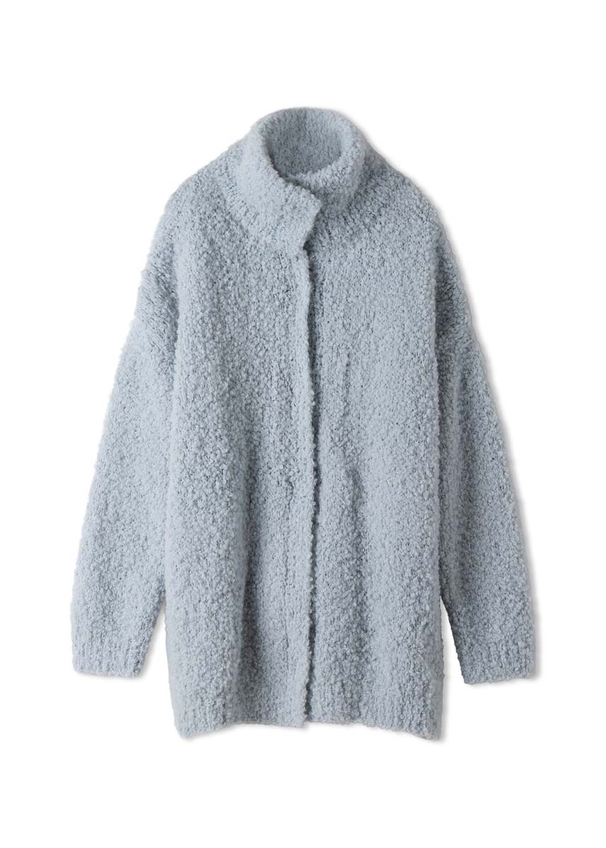 Lana Grossa qualité Orsetto (60 % laine vierge (mérinos), 40 % alpaga (superfin), LL = env. 75 m/50 g) : 650 (750) g en bleu-blanc (col. 1) ; aiguilles n° 5 et 6 ; 1 aiguille circulaire n° 6 (60 cm) ; 6 boutons-pression transparents à coudre, Ø 25 mm.