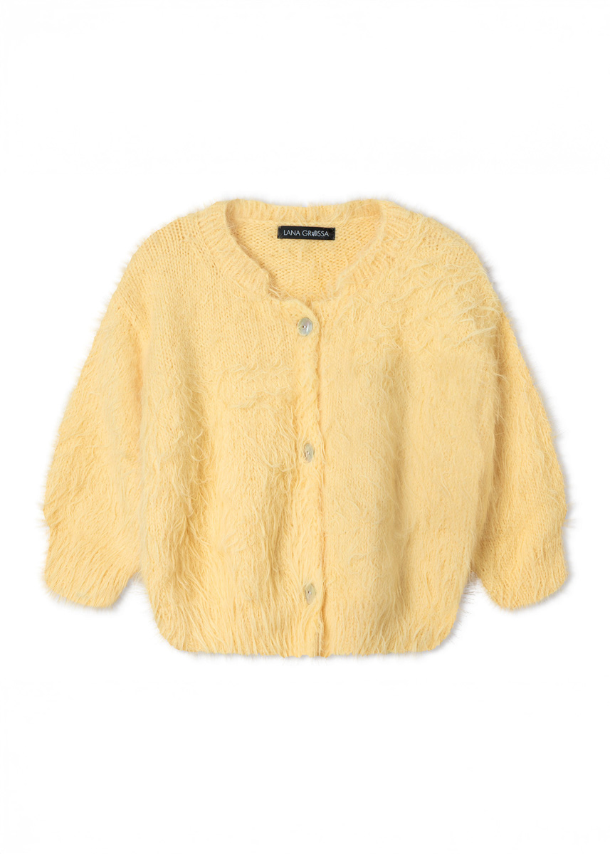 Lana Grossa qualité « Basta » (50% laine vierge (mérinos), 50% polyamide, métrage environ 100 m/50 g) : 350 (350 - 400 - 450) g de vanille (col. 32) ; aiguilles à tricoter de taille 4 et 5 ; 3 (4 - 4 - 4) boutons en nacre, 20 mm de diamètre.