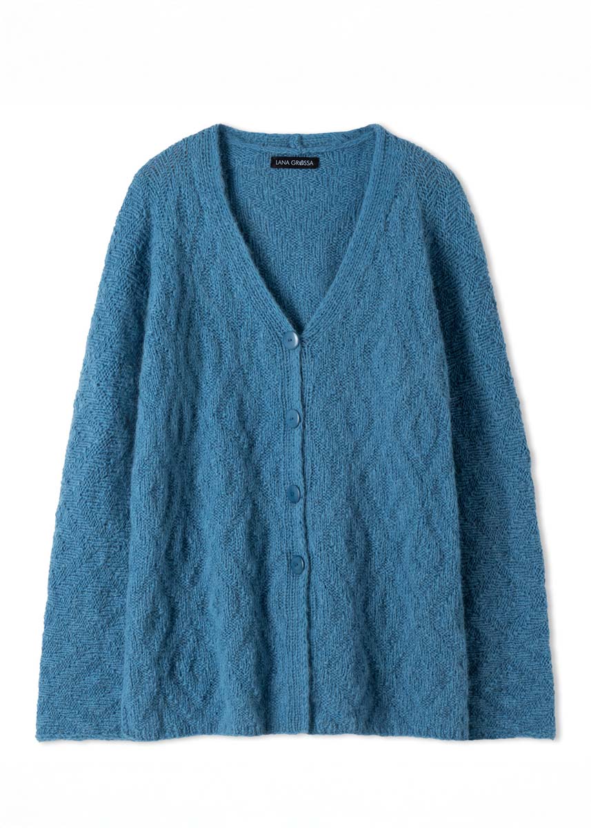 Lana Grossa qualité Nebbia (55 % laine vierge (mérinos extrafin), 45 % alpaga (bébé), longueur 170 m/50 g) : 400 g en bleu pigeon (col. 5) ; aiguilles n°5 ; 1 aiguille circulaire n°5, 120 cm de long ; 4 boutons bleus de Union Knopf, 25 mm Ø, réf. 454233, col. 64.